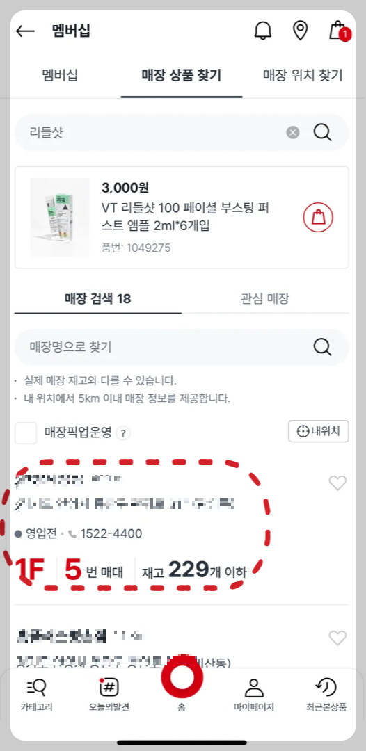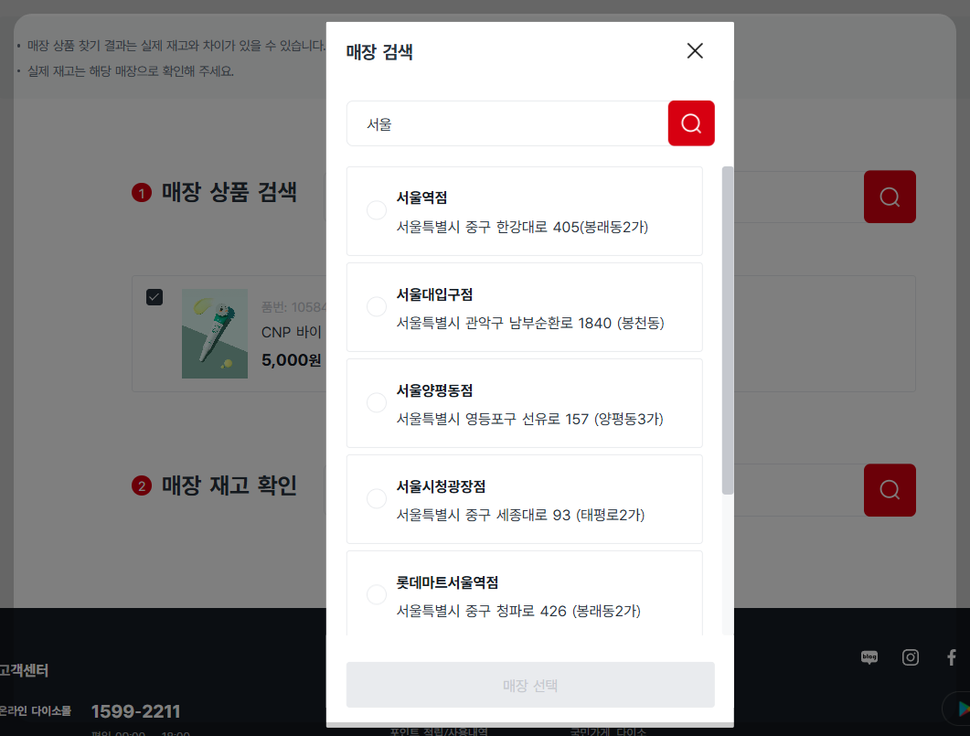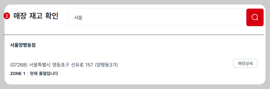 원하는 제품을 클릭하면 이렇게 내 위치와 가까운 매장들의 재고 현황이 바로 보입니다.