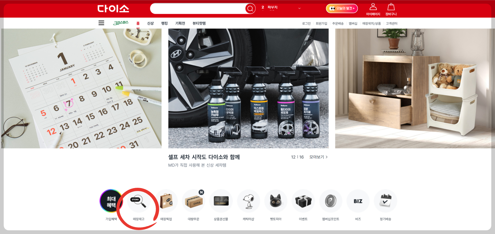 다이소 홈페이지 메인의 [매장재고] 아이콘을 클릭합니다.