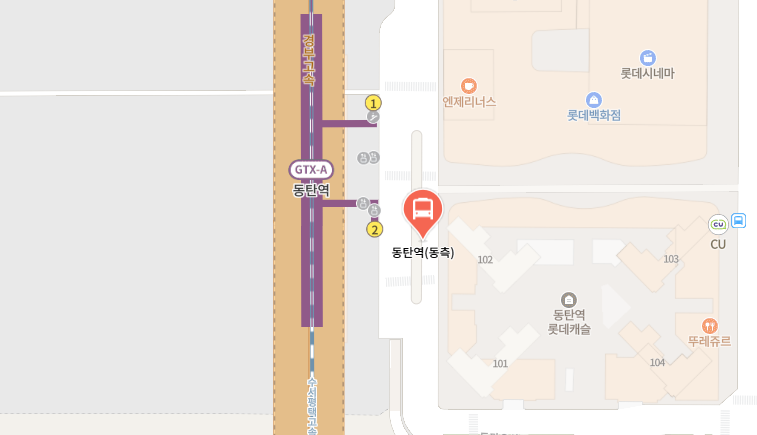 동탄역 1,2번 출구로 나와서 도로 중앙 정류장에서 승차하세요.