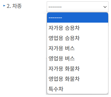 2. 차종: 용도(자가용/영업용) 및 종류(승용차/버스/화물차)에 따라 해당사항을 선택합니다.