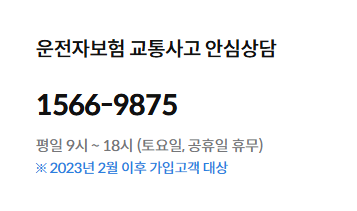 - 운전자보험 교통사고 안심상담: ☎️ 1566-9875 (운영 시간: 평일 오전 9시 - 오후 6시) ※ 23년 2월 이후 가입고객 대상