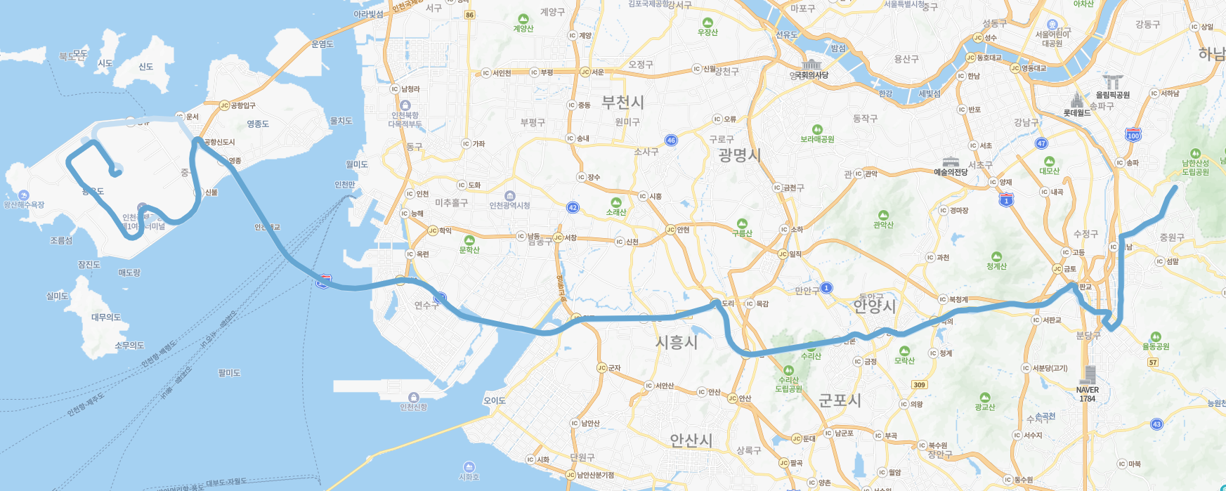 성남에서 인천공항까지 주요 정류장에서만 정차하고 나머지는 경유해서 지나갑니다.