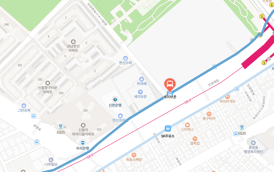 세이브존 앞 좌측 횡단보도 건너에서 승차하세요.