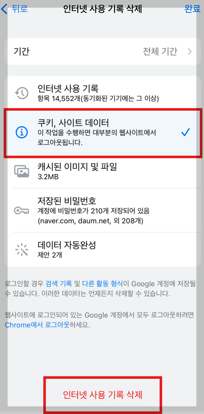 "쿠키, 사이트 데이터"를 선택한 후 "인터넷 사용 기록 삭제"를 클릭하여 완료합니다.