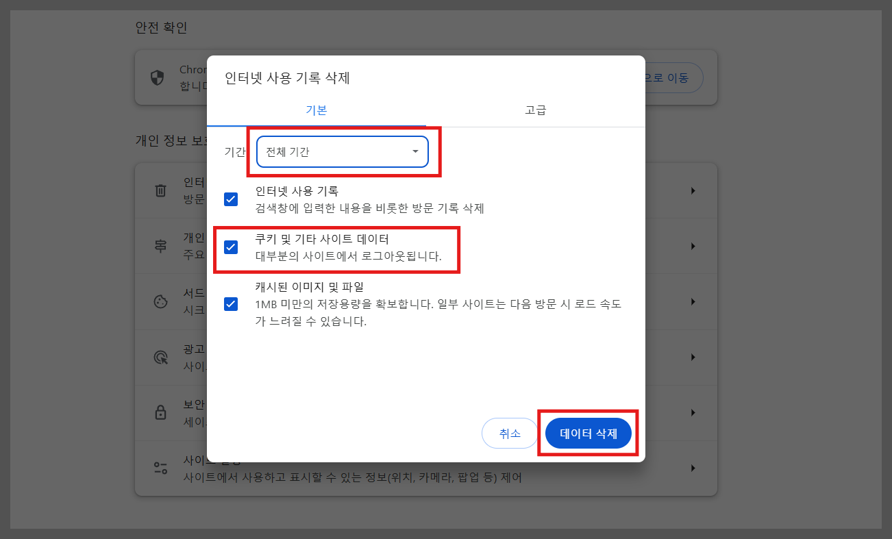 기간을 "전체 기간"으로 설정하고, "쿠키 및 기타 사이트 데이터"에 체크 표시 한 후 "데이터 삭제"를 클릭합니다.