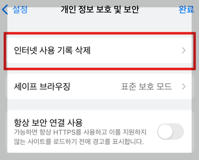 개인 정보 보호 및 보안에서 "인터넷 사용 기록 삭제"를 클릭합니다.