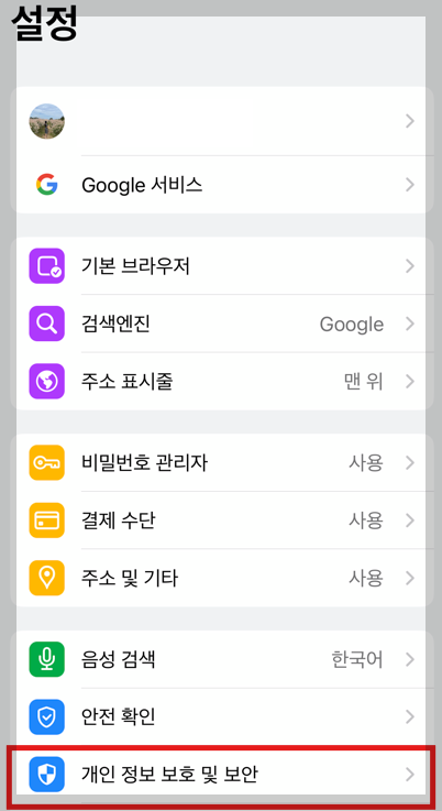설정에서 개인 정보 보호 및 보안을 클릭합니다.