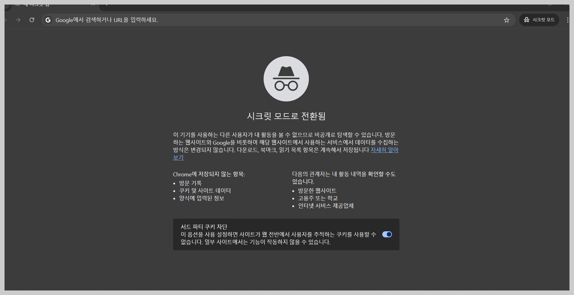 시크릿 모드 사용 중이라는 문구가 보이면 완료입니다.