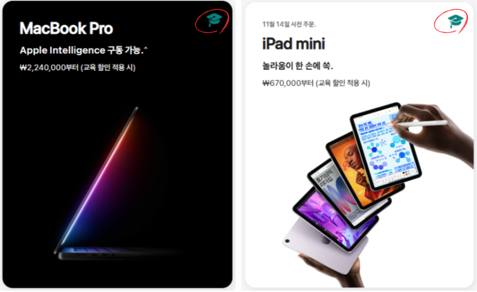 애플 교육 할인 스토어에서 할인 제품을 찾는 방법은 간단합니다. 주요 할인 적용 제품에는 ‘교육 할인’ 표시(녹색 학사모 아이콘)가 되어 있어 쉽게 구분할 수 있습니다.