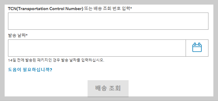 · TCN을 통한 배송조회: 정부 기관 주문용 수송 통제 번호(TCN: Transportation Control Number)를 통해서도 배송조회가 가능합니다. 번호 앞에 공백을 넣거나 "TCN"을 붙이지는 말고 입력하세요.