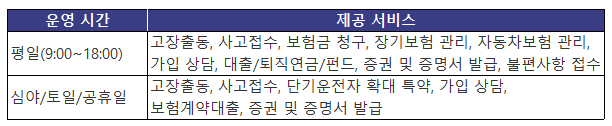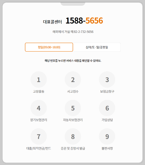 · 평일(9:00~18:00) : 고장출동(1번), 사고접수(2번), 보험금 청구(3번), 장기보험 관리(4번), 자동차보험 관리(5번), 가입 상담(6번), 대출/퇴직연금/펀드(7번), 증권 및 증명서 발급(8번), 불편사항 접수(9번)