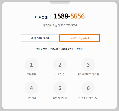 · 심야/토·일/공휴일: 고장출동(1번), 사고접수(2번), 단기운전자 확대 특약(3번), 가입 상담(4번), 보험계약대출(5번), 증권 및 증명서 발급(6번)