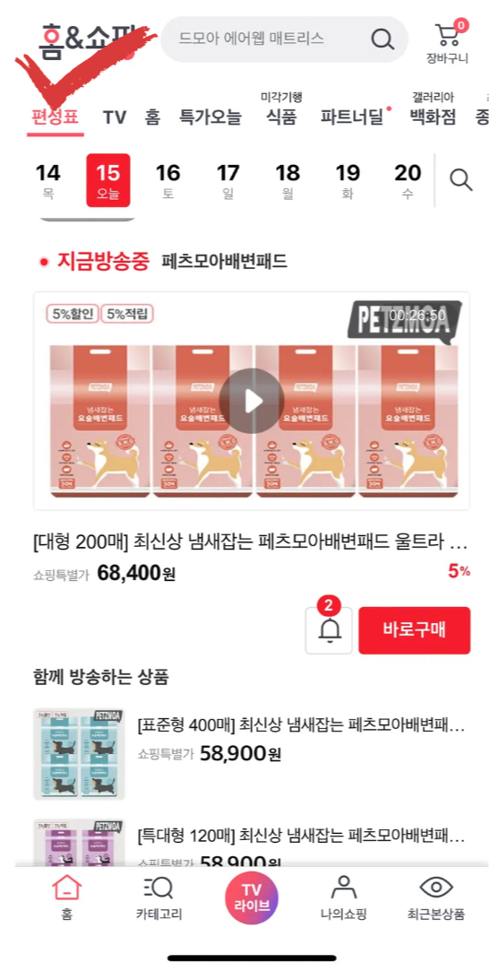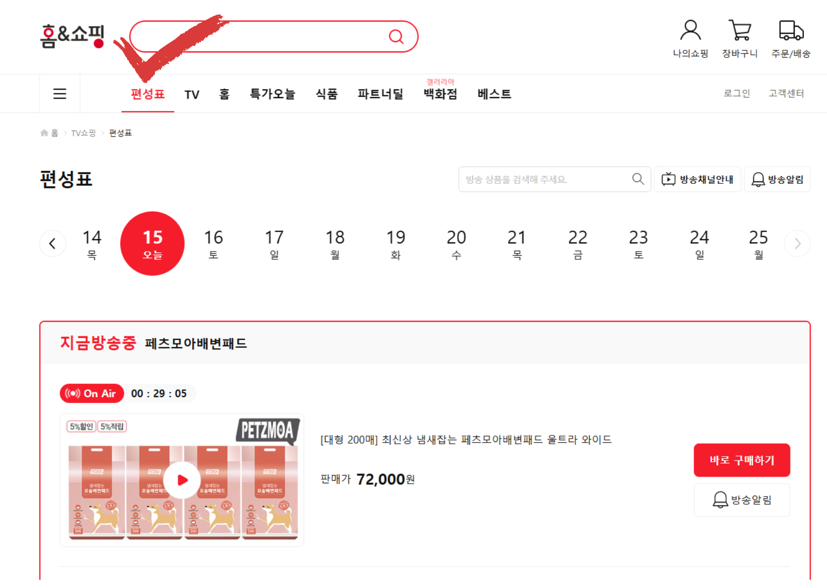 홈페이지 접속 → '편성표' 메뉴 선택 → 날짜별 상품 확인